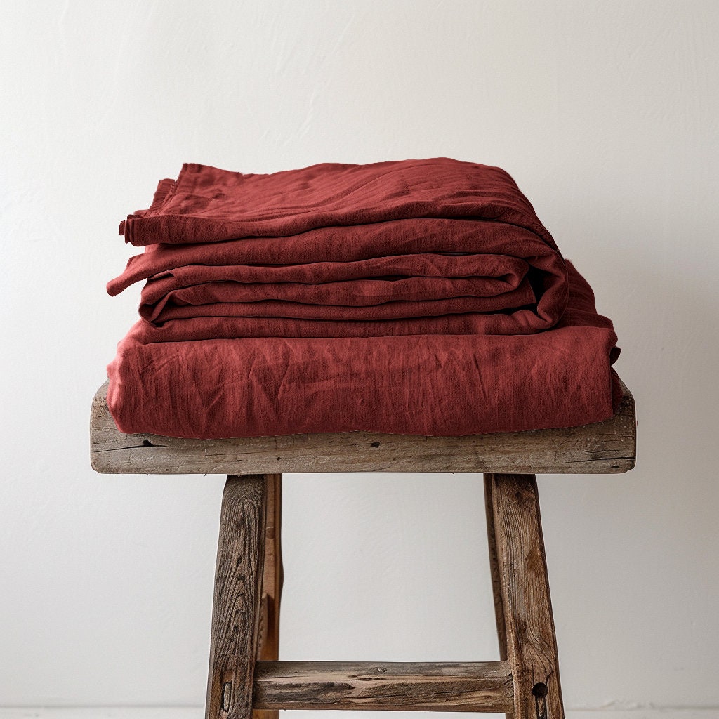 Linen Duvet Cover Set with 2 Pillowcases in Fire Brick Red color offered in 2 fabric weight variations: Medium weight linen (170GSM2) and Heavy weight linen (240GSM2)